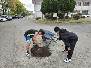 その後は、本校へのボランテイアということで、付近の道路工事をされていた業者の方が、ご厚意で穴を埋めてくださいました。
