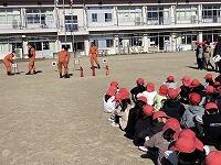 非常ベルがなってそれぞれの学級から運動場へ避難しました。避難後には、南消防署の方から火災の避難の仕方、消火器の扱い方、消火の仕方についてお話がありました。