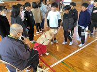 都城の伝統工芸の一つである大弓について、4年生が体験学習を行いました。講師に、楠見純寛様、南﨑裕一様、関係者3名をお迎えし、体育館で学習しました。