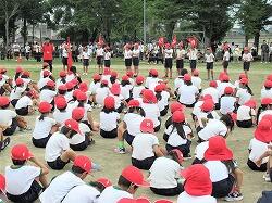 さわやかな青空のもとはじめての全体練習です。赤団白団の団長を中心に、子どもたちが主体的に行動する練習を目指して取り組みました。団長と副団長が大きな声で練習をリードしていました。