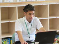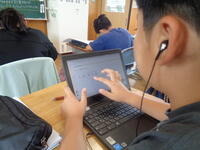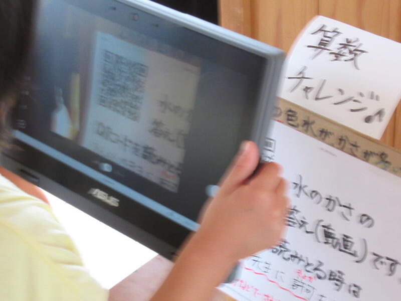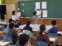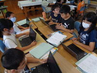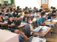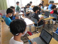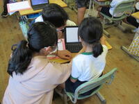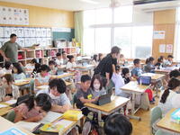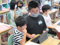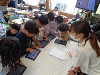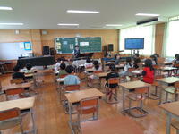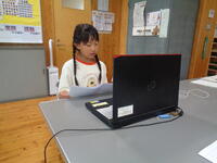 1年生の教室では机上に、教科書、プリント、端末(PC)がおいてありました。1人1台端末を活用しながら学習を行っていましたが、鉛筆をもって、しっかり書く場面を設定し、読んだり発表したりする子どもの姿もありました。端末の画面越しに話合いをしている場面もあり、様々な学習形態を使い分けている国語の学習でした。端末の効果的な活用とともに、書くこと、読むこと、発表することを大切にしている1年生の成長がますます楽しみになりました。