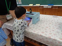 内容は、1年生が生活科で作った手作りおもちゃコーナーで、園児をおもてなしして、楽しい時間を過ごしました。手作りのどんぐりごま、やじろべえ、めいろ、さかなつりなど1年生の説明も上手にできていました。