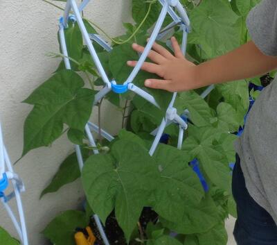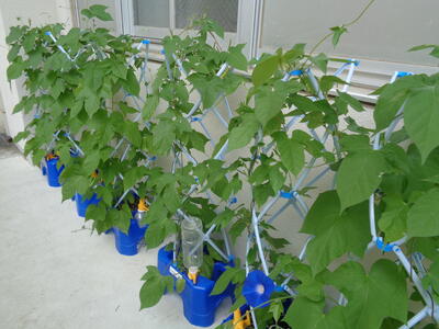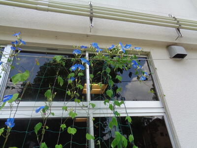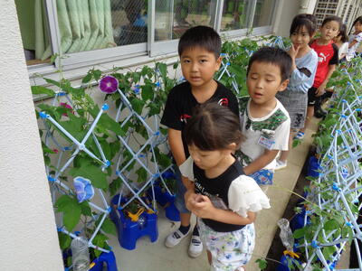 「あさがおの花が咲きました。」「つぼみもたくさんあります。」「昨日咲きました。」「もうしぼみました。」「はっぱがぼくの手より大きくなりました。」「はっぱが食べられました。」1年生の子どもたちからたくさんの発見を教えてもらいました。大切に育てていますね。