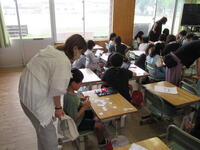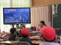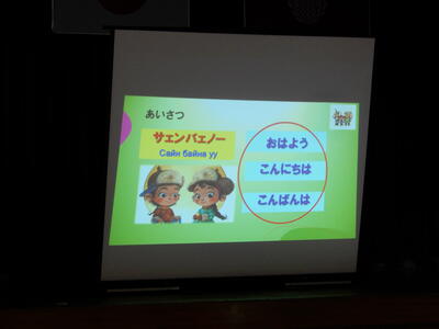 案内する場所は、体育館、運動場、図書室、音楽室、5年生の教室でした。玄関に待機されたカルメン先生を、教室のテレビに映った映像の移り変わりを見ながら、子ども達は上手に案内していました。