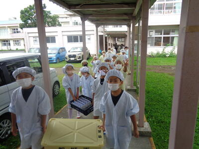 今日も給食委員の子どもたちの見守りによって給食の準備がはじまりました。無言で準備ができていますか、整列していますか、並んで運んでいますか・・・。先生たちと一緒に給食委員の子どもたちが注意喚起をしています。給食コンテナ室から教室に移動するまで安全に運搬していますね。いつもありがとうございます。