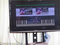 最初に、伊藤先生が、音楽室の大型テレビに楽譜や鍵盤の映像を映しながら、ジブリメドレーとパイレーツオブカリビアンを演奏しました。途中楽器の説明をされ、リコーダーと同じ吹き方では音が出ないことを教えていただきました。