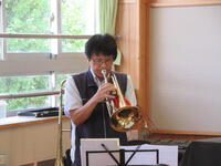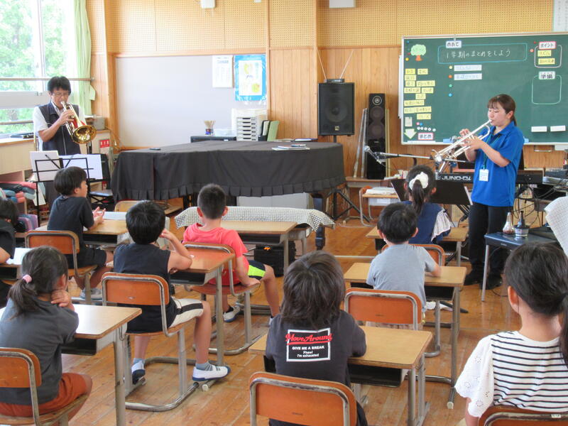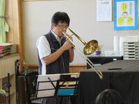 最後に、運動会ではおなじみの「トランペット吹きの休日」をお二人で演奏してくださいました。子どもたちも聞きなれたメロディーで笑顔で演奏を楽しんでいました。やはり生の演奏、楽器を紹介しての授業は感動的でした。先生方ありがとうございます。