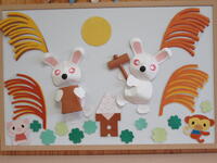 この絵は、団の児童にアンケートをとってキャラクターを選んだものを、6年生が模造紙に大きく描きました。また、団の児童は、それぞれに小さいカードに自分の団のキャラクターを描きました。最後にそれを一緒に貼り合わせて、みんなの団の絵が完成しました。