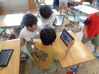 1年生の教室ではオンラインの接続練習がはじまりました。教え合い、学び合いによって次々とみんなの顔が画面に映し出されると歓声があがりました。顔を見ながら手を振り合ったり、画面ごしに手を振り合ったり楽しい時間となりました。自宅とつなぐ練習ももうすぐです。