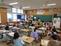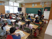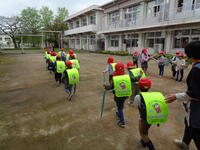 新1年生、どきどきの1日でした。新しい教科書や電子黒板で勉強をしました。簡単なゲームもしました。学びが始まってますね。帰りも1列で出発、さすがです。