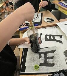 何をしているかというと、筆を洗っています。用意した2本のペットボトルに筆先を入れて洗います。