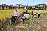 地域の方々と保護者の皆様に助けていただいて稲刈りと足踏み脱穀機を使った脱穀体験を行いました。