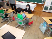 学校を休んだとき、「みんな何をしてるのかな」と思っている子どもたちのためにオンラインによる学習中継があります。熱があるのに無理をして・・・、とならないように保護者の方や本人の気持ち等に配慮しながら行います。音楽室ではリコーダーの練習と御家庭がオンラインでつながっていました。休み時間は手を振り合ったりおしゃべりしたり楽しく過ごしていました。この日は給食も含めて多くの時間がつながっており、さよならのあいさつも一緒に行いました。「さようなら、また、明日ね。」と手を振り合っていました。