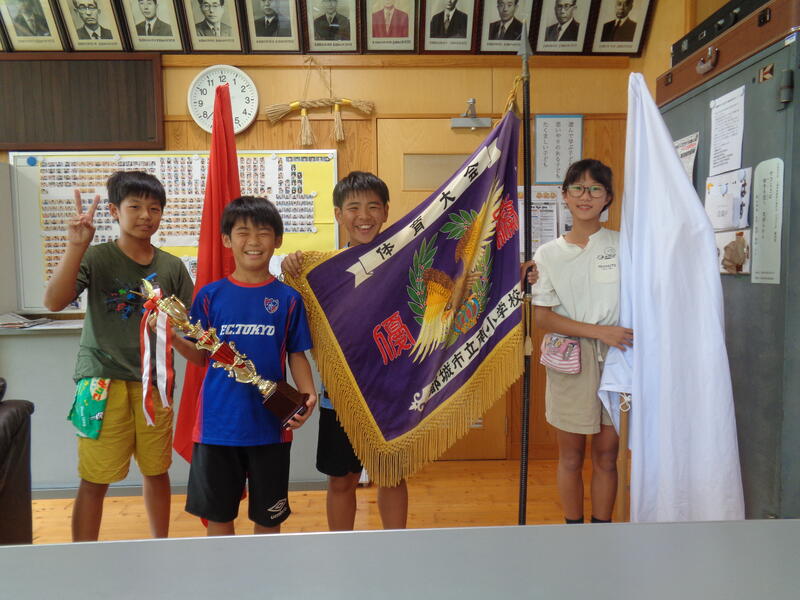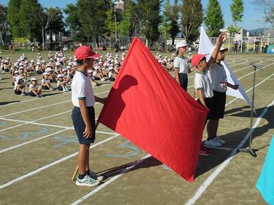 今日は給食放送の時間に、赤団と白団の団長、副団長による応援合戦が行われました。4人の応援メッセージは、各団が心を一つに優勝を目指すものとなり、熱い思いが伝わるすばらしいものでした。優勝旗と応援賞トロフィーを交互に持ち、互いの検討を誓い合いました。