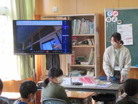 案内する場所は、体育館、運動場、図書室、音楽室、5年生の教室でした。玄関に待機されたカルメン先生を、教室のテレビに映った映像の移り変わりを見ながら、子ども達は上手に案内していました。