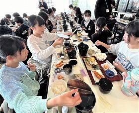 昼食は、自分で食べられる量だけとっていくセルフ方式です。給食とはちがうスタイルで、それぞれに考えながらおかずを皿に移していました。