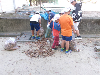 校庭に降りしきる落ち葉を協力して集めます。上級生がほうきの使い方を教えたり、集めた落ち葉を優しく袋に入れたりしながら、活動が進められました。