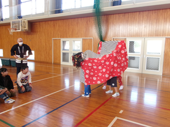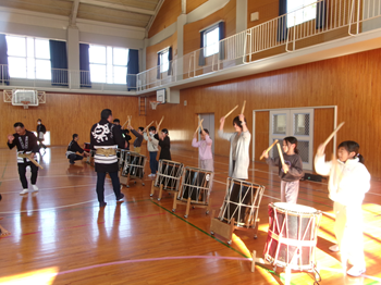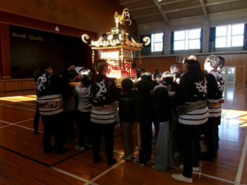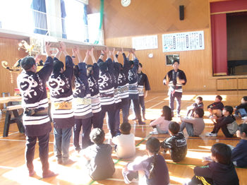 保存会の皆様から、太鼓の打ち方、獅子舞の動き、そして祭りの活気ある掛け声、みこしの担ぎ方について、熱心なご指導を受けました。  「粋な」心意気や、地域を愛する気持ちを肌で感じることができ、子どもたちの目は真剣そのものでした。