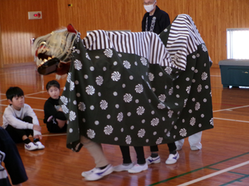 子どもたちは、地域の祭り「おかげ祭り」で実際に使われる神輿、太鼓、獅子舞に触れる貴重な体験をしました。