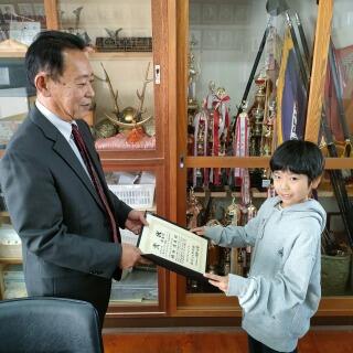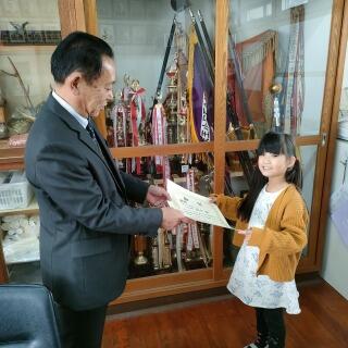 都城市のプレゼンコンテストに応募した6年生チーム(赤間真彩さん、中島瑛都さん、宗像美心さん、山下佳凛さん、南脇蓮さん)に表彰状が届きましたので、校長室にて表彰しました。佳作入選です。