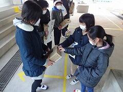 ↑ 児童玄関前で、たくさんの中学生が迎えてくれました。