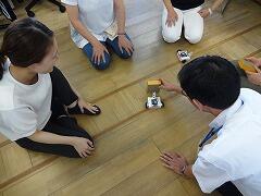 説明を聞きながら、自分たちでプログラムを組み立てて、多角形をかいたり、模型の車を障害物の手前で止めたり、豆電球をつけたりしました。