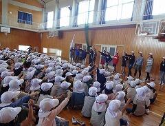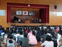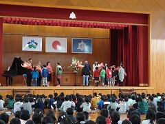 ↑ 新2~6年生で元気に校歌斉唱をしました。