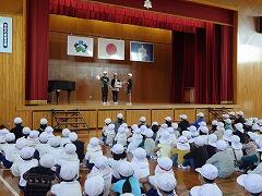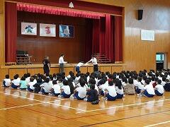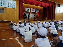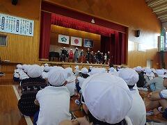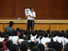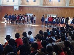 体育委員会の5・6年生が、ステージで息をしっかり合わせて、「気を付け、休め」や行進、駆け足などの手本を見せてくれました。
