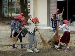 子ども達はJRCのバッジをつけて、校内のいろいろな所を一生懸命ほうきで掃いたり手で拾ったりして、袋いっぱいにたくさんの落ち葉を集めていました。