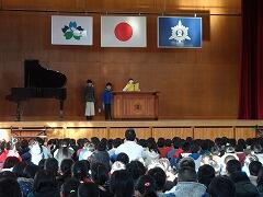 始業式と終業式では、毎回子ども達がその学期のめあてや振り返りを発表しますが、今回は3年生の代表3人が2学期を振り返って発表を行いました。