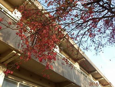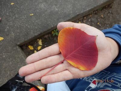 写真を撮っていると、これから下校する4年生の男の子が綺麗に赤く色づいた葉っぱを手に、「妹に持って帰ります。」と声をかけてくれました。