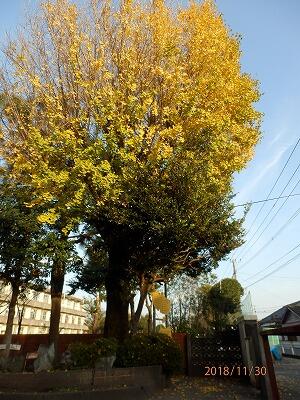 ↑ 正門前のイチョウは今が紅葉の盛りです。