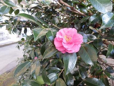 中庭の築山には、サザンカの赤い花が少しずつ咲き始めていました。