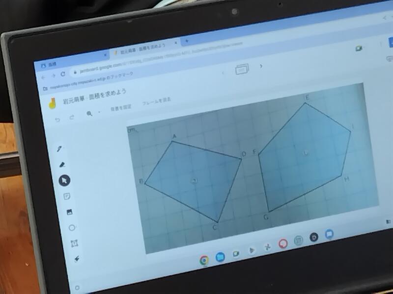 まず、Google jamboardを使って、自分の考えをタブレット画面に書き込みます。そして、グループで自分の考えを伝え合い、友達の考えを聞きながら、面積を求めていきます。