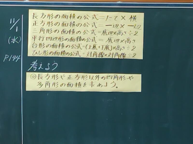 単元は「面積」です。その中の、「多角形の面積を、三角形の面積の求め方を使って求める」学習でした。