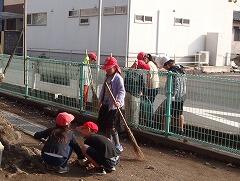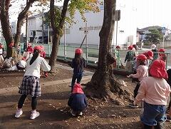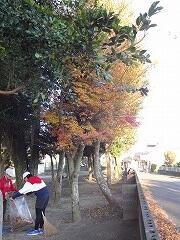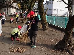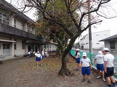 ↑ 運動場北側。色づいた紅葉の下で、高学年がボランティア活動を。