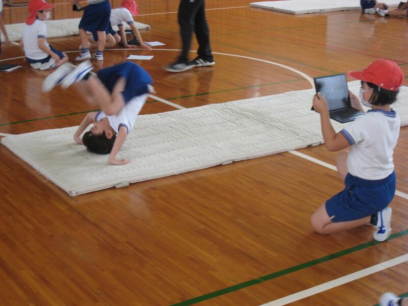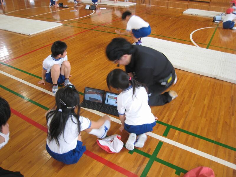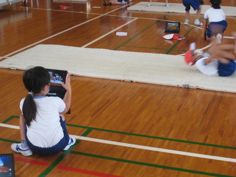 子どもたちは、グループ内の友達に頼んで、自分のタブレットに動きを録画してもらいます。