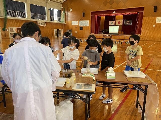 霧島酒造は、焼酎粕を直接廃棄することなく、メタン菌を混ぜることでメタンガスを取り出し電気を作り出して利用し、その後の焼酎粕を肥料としても再利用しているそうです。今回は、実際にどのようにメタンガスを取り出すのを実験で試したり、作った電気をもとにした電気自動車「イーモ」を見学したり、芋を洗った後の水をきれいにする実験をしたりしました。