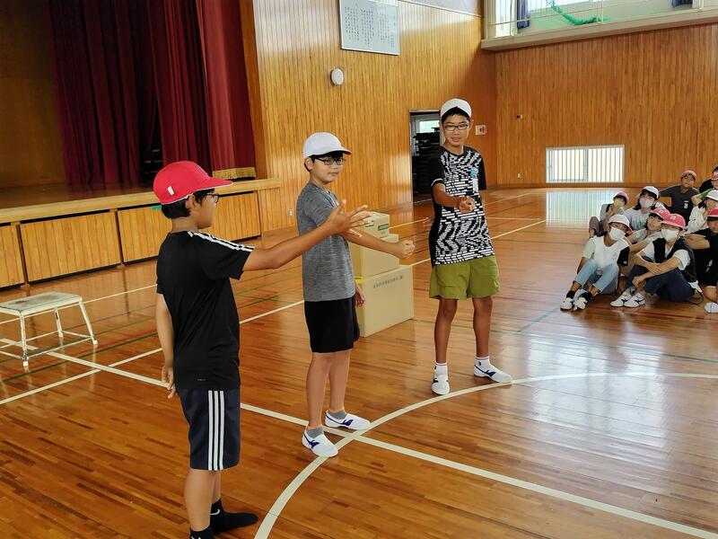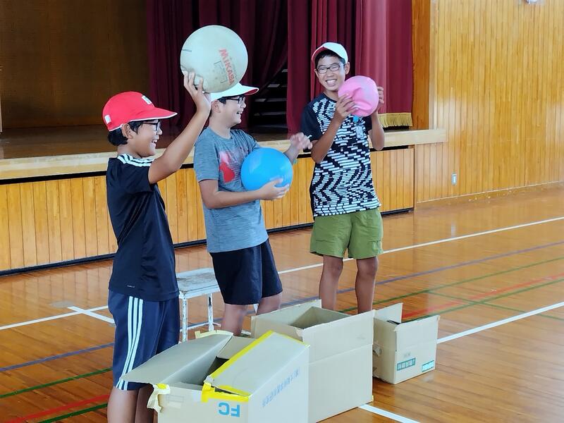 団の色を表すボールが入った段ボールを選ぶためのじゃんけんをしました。その結果、A団、B団、C団の順に箱を選ぶことになり、選んだのは、A団大、B団中、C団小でした。箱を一斉に開くと、