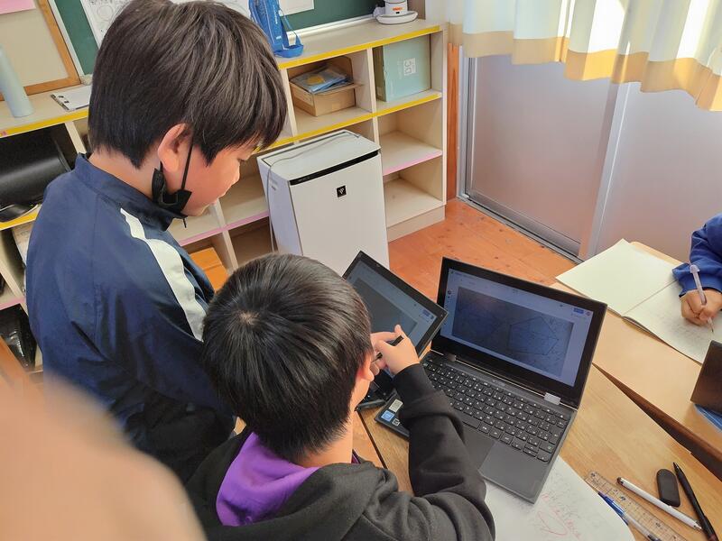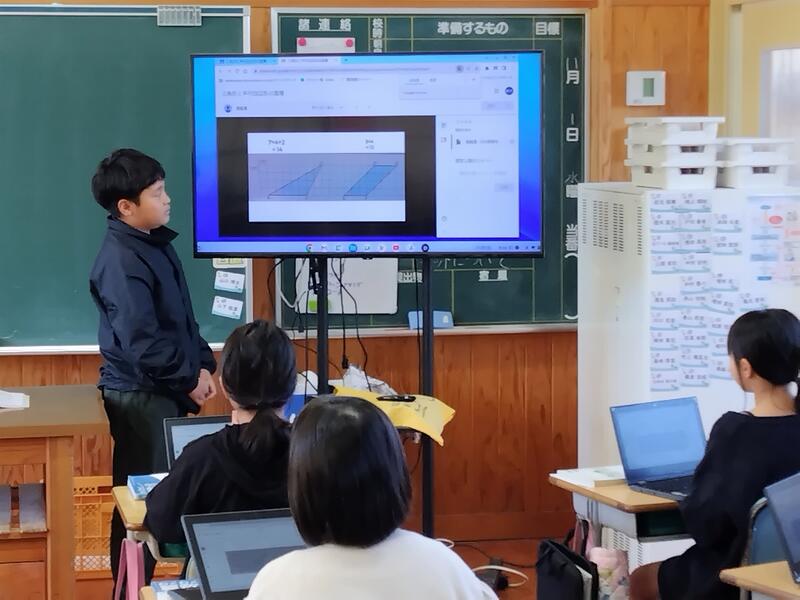 まず、Google jamboardを使って、自分の考えをタブレット画面に書き込みます。そして、グループで自分の考えを伝え合い、友達の考えを聞きながら、面積を求めていきます。