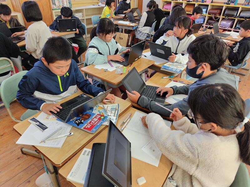 タブレットを使うことで、子どもたちの話合いはとても活発でした。ノートを使って話し合う、これまでの姿とは違います。