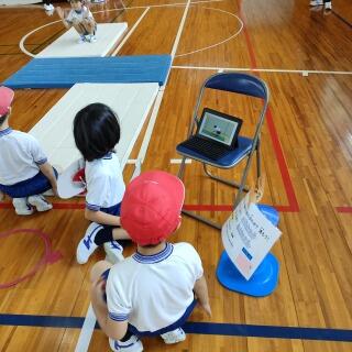 2年生の授業では、マット運動のいろいろな技について、タブレットPCで動画を見て確かめながら練習していました。