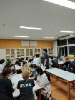 次のレクは、ボール送りゲーム。まずは説明を聞きます。運営委員会の児童の皆さんが説明してくれました。