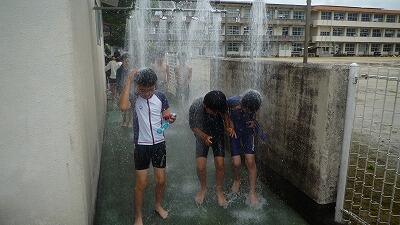 大きなペットボトルを持っています。そして衣服を着用しています。そうです。夏休みに向けて「着衣泳」の練習をしていたんですね。