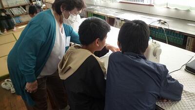 ミシンはちょっとしたことで動かなくなったり、糸がからまったりなど、慣れるまでに時間を要します。あまりふだん使わないからですね・・・・・そこで地域のボランティアの皆様にご協力いただいているのです。最初の写真にたくさんの先生が映っていたのは、そういうことだったんですね。