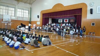 これは、次週、MJホールで市音楽大会に4年生が出場するため、その校内お披露目と、日頃、各種コンクールに出場している合唱部が九州大会で金賞を受賞したことを祝し、これまた校内お披露目ということで時間を設けました。せっかくの機会ということで4年生、合唱部の保護者もお招きしました。
