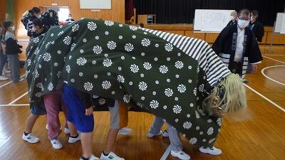 こちらは獅子舞ですね。獅子舞の仕組みや動かし方、獅子舞の役目や目的などのお話をしていただきました。こちらも挑戦しましたよ。