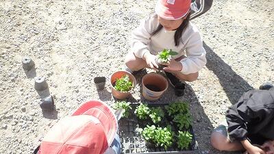 花の苗ですね。パンジーです。この苗は、全員が一人一鉢活動として大事に育て、6年生の卒業式にはきれいに彩ってくれると願ってお世話します。そのために、今日は鉢植えを行いました。