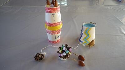 このほかにも、やじろべえ、どんぐりごま、松ぼっくりを使ったマラカスの演奏など、子供たちの創意工夫あふれるコーナーがたくさんあって、幼保園のお友だちも目を輝かせていました。