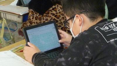 道徳の学習のようです。タブレットに自分の考えを書き込んでいるところでした。